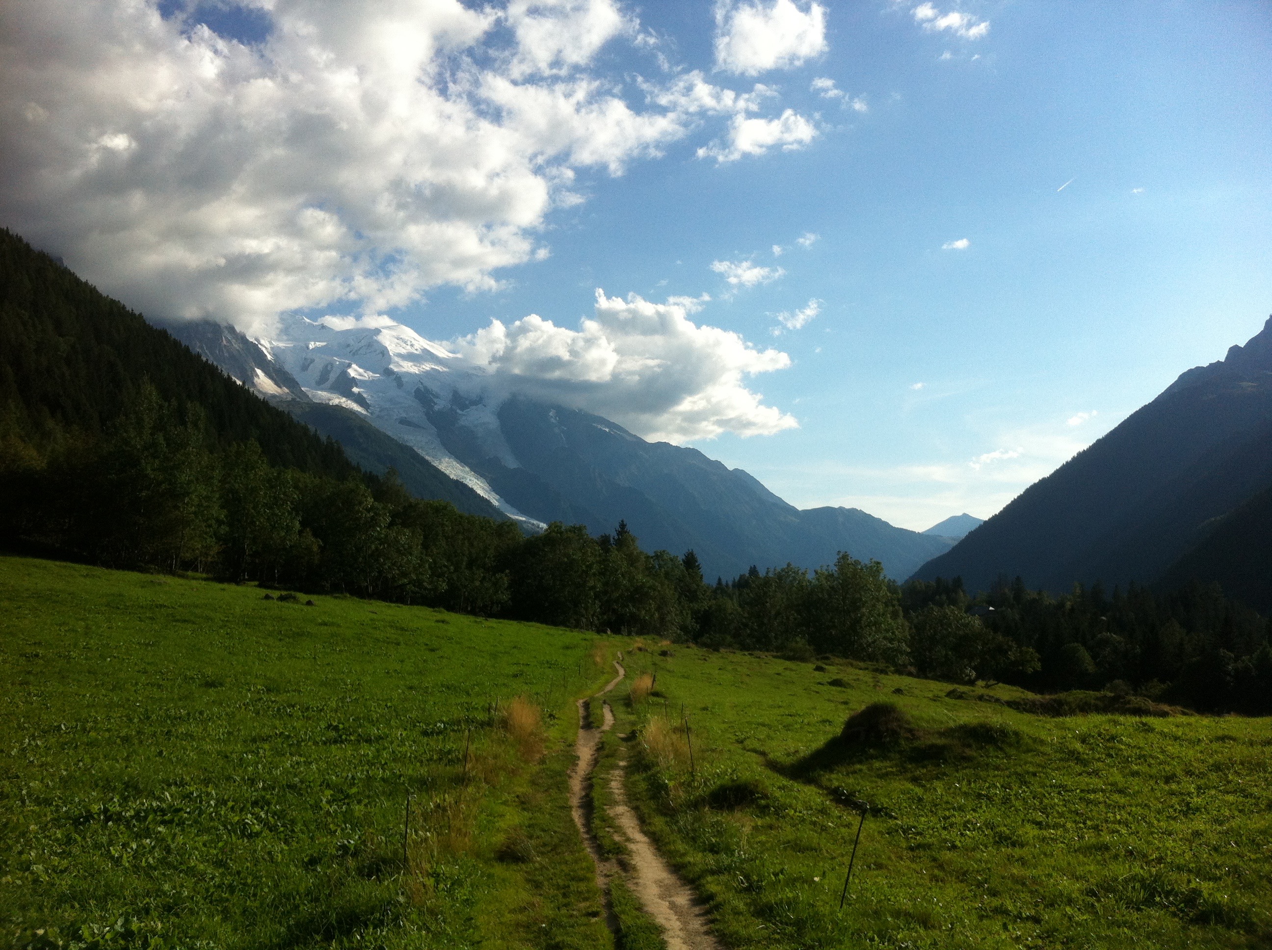 After buying some necessary hiking items such as water and gas for the Jetboil boiler, we started the 1st part of the Haute Route walking along the river and continued up to the The Petit Balcon Nord. The path was different from the one in our guidebook, but recommended by the guy at the Maison de la Montagne. After coming out in the pasture, we could clearly see the Mont Blanc mountain range behind us and could not help but turning our head back again and again to get another glimpse of the majestic scenery.