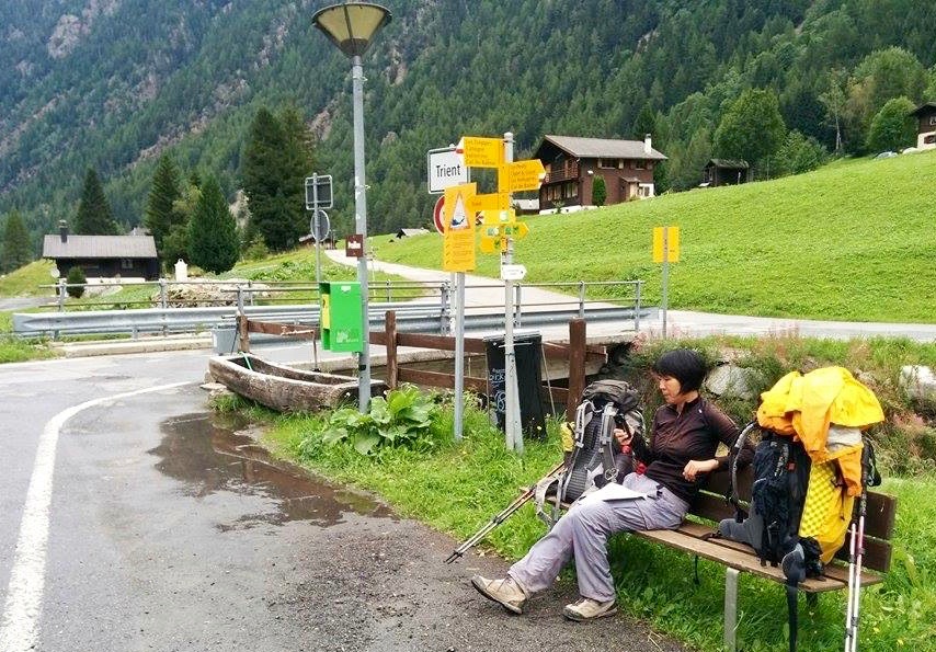 Sano and I intensively debated tomorrow’s hiking route over late lunch on the terrace. In the meantime, more and more hikers in wet rain gear were arriving at the hotel, with a couple of big groups that seem to be doing the Tour de Mont Blanc (TMB). The first two or three days of our route are overlapping with the TMB so there were a lot of people in this small village of Trient where only two hotel/dormitories exist! By dinner time, the hotel was completely packed with hikers.