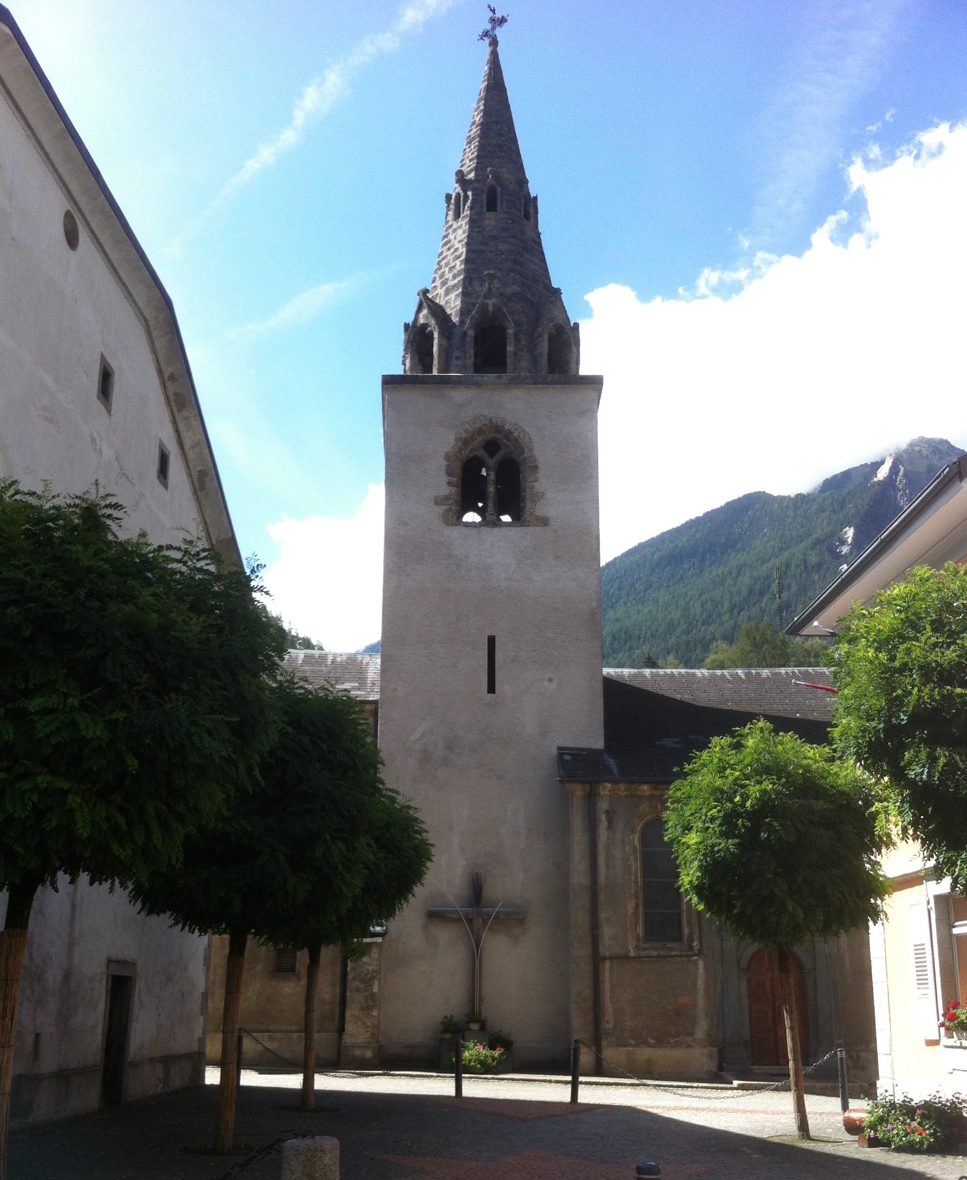 After a couple of hours we arrived at Sembrancher which is located pretty much at the bottom of the valley. A charming village with a cobbled-stone square and a church. Going through the village and admiring charming old wooden houses, we looked for a good spot for lunch.