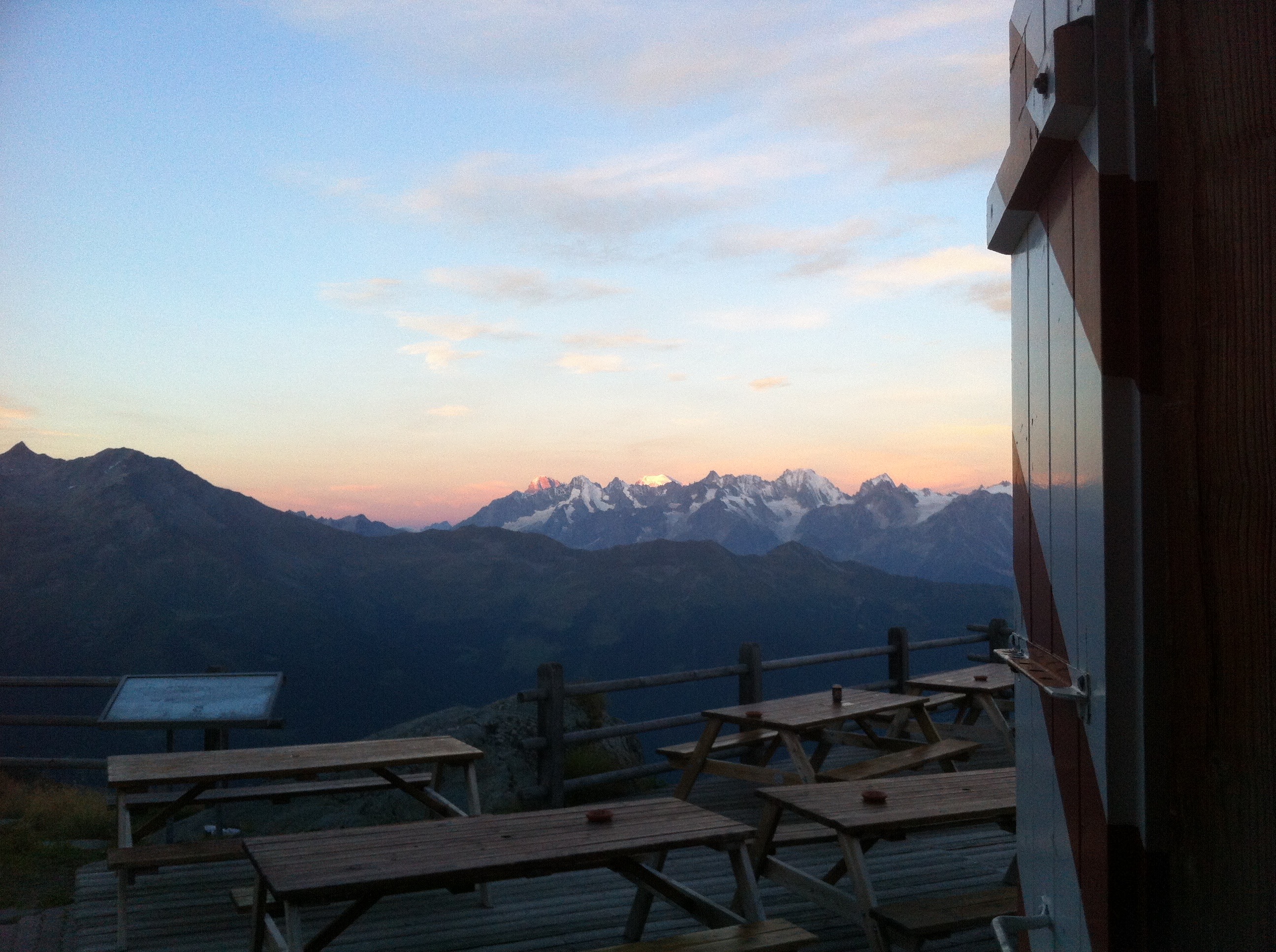 In the middle of breakfast we heard other hikers’ “ohh” and “ahh”. When I looked out of the window, the sun started illuminating the distant Mont Blanc. We all hurried outside with cameras. The air was still cold but the sky was clear. The snow on the Mont Blanc was glowing in pink.