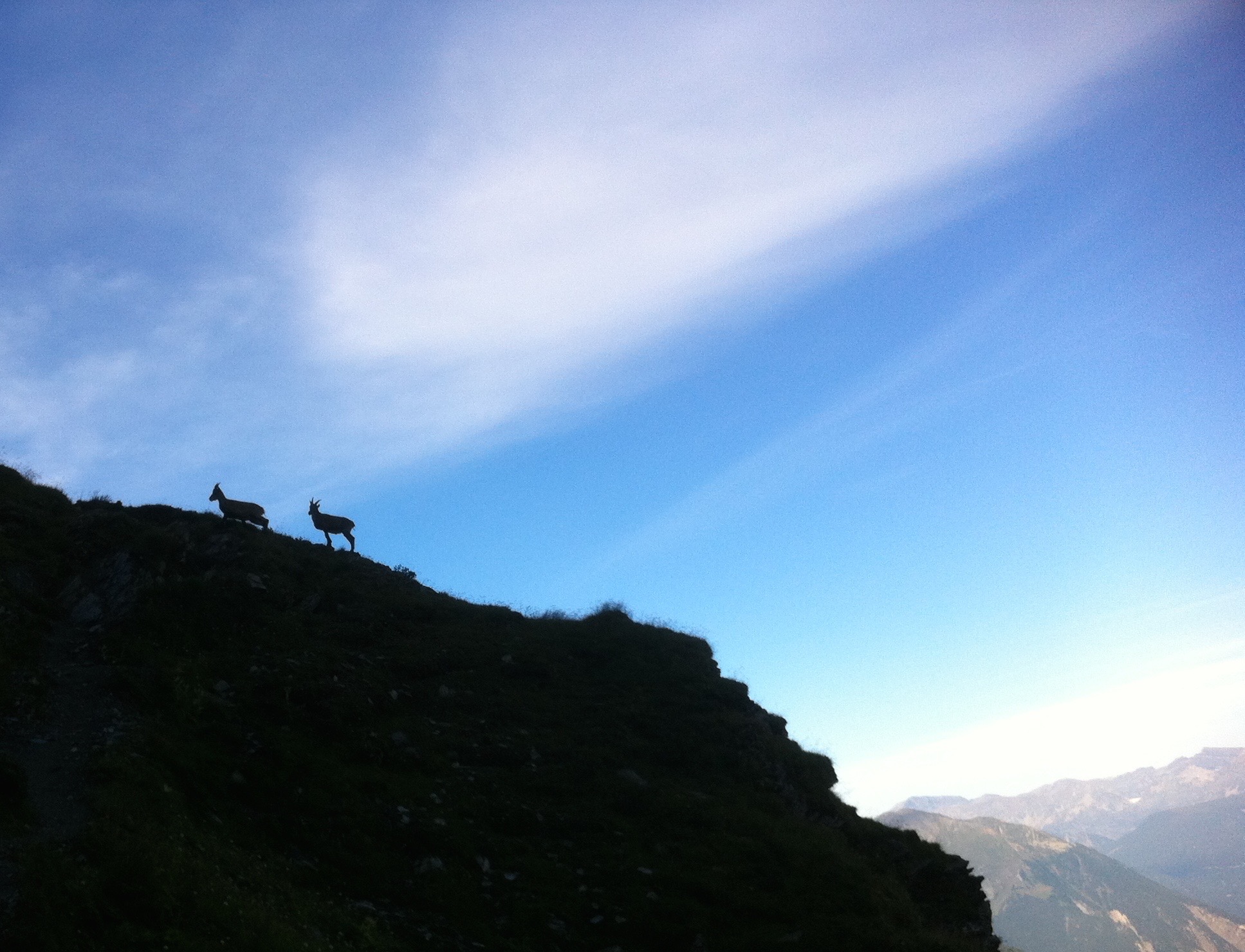 While we were traversing the steep slope on a narrow path, 6 or 7 chamois appeared on the ridge above. The silhouette of their slender body contrasted against the blue sky. What a beautiful sight! They looked at us for a while and then ran away higher up.