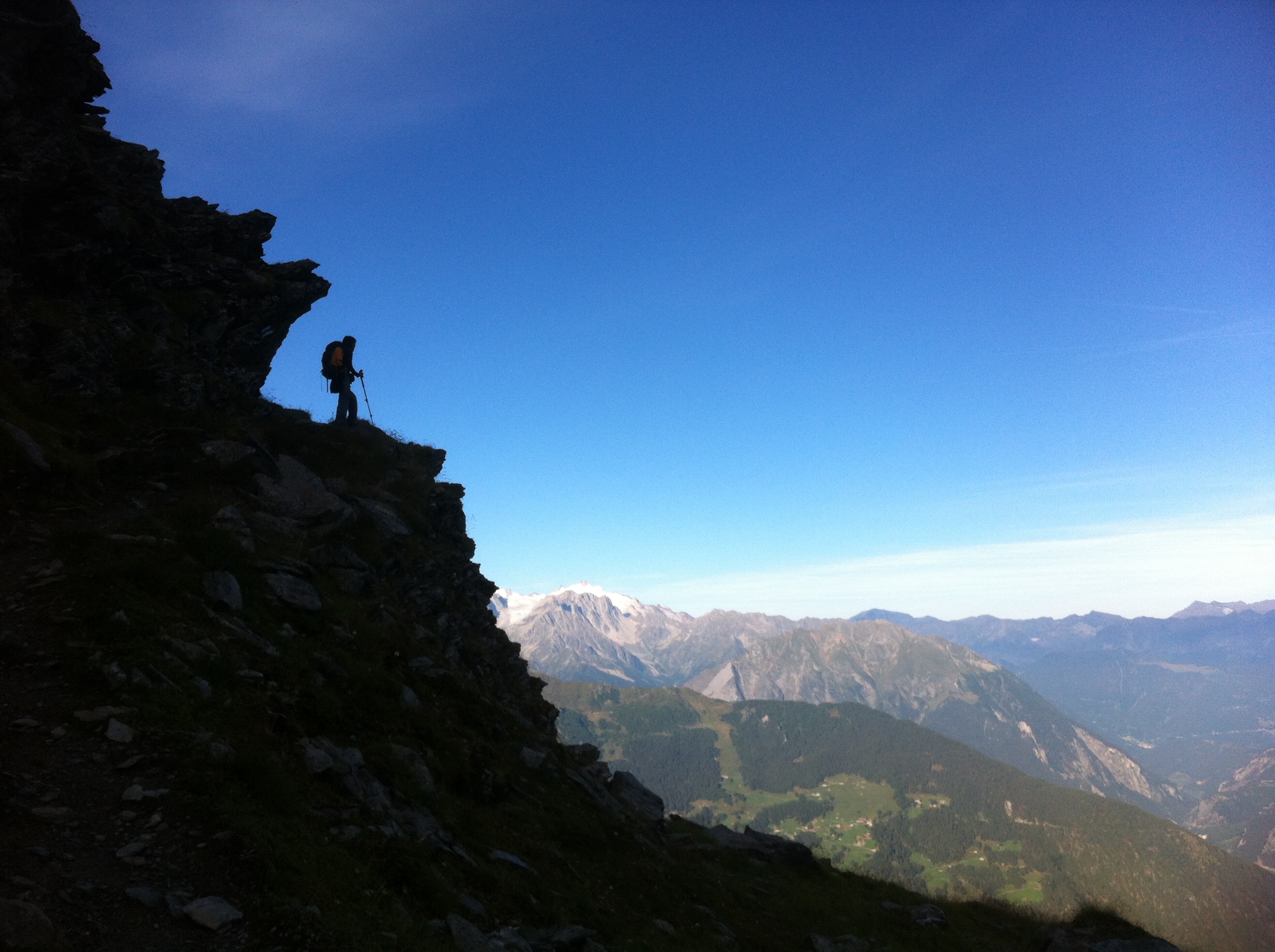 We kept traversing the slope as if we were heading direct into the massive snow-covered Combin, which soars aloof across the valley. The Grand Combin (4’314 m) is so dominant that we could not keep our eyes off! However, the trail was narrow and it required our full attention! On our right, the valley was just about 1’000 m down a pretty steep slope.