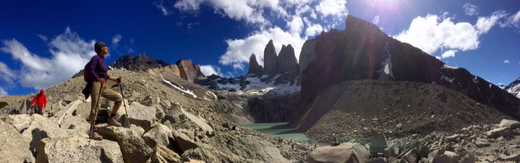 The last climb through gravels and rocks suddenly gives way to the white-green glacier lake and soaring granite pillars of Paine (2’850 m)! Stunning!