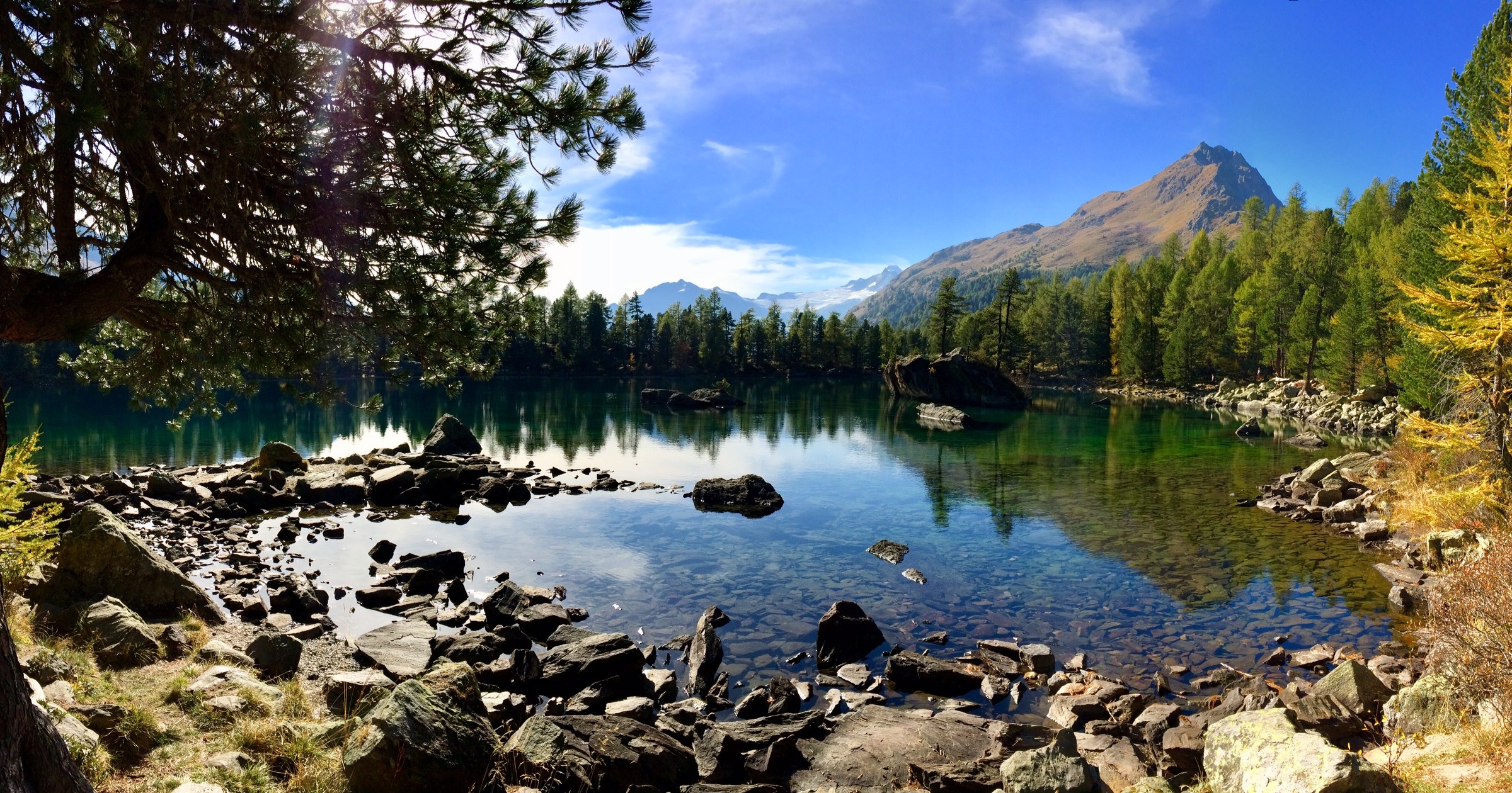 Today, the Val da Viola circles around the lake in a very autumn colors atmosphere. From the highest point of today’s trail (2258m) I see the snow-capped Piz Palù (but not Piz Bernina!) and the Morteratsch Glacier. The main purpose of this hike was to see the Lake Saoseo, but this part of the trail on this valley was another highlight!