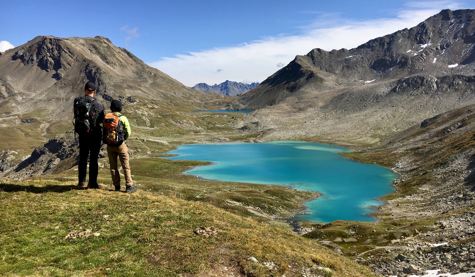 We have been talking about this hike for a couple of years now. I vaguely remembered the Vereina hut and its surroundings since we hiked around the area quite some time ago. Today was such a beautiful day with the blue sky. So off we went by train to Susch and then by bus to Wägerhus, the trailhead. After about two hours of steady uphill from Flüelapass, we reached the pass with an incredible view of three of the four Jöriseen – a perfect lunch spot. The color of the lakes was simply amazing and hard to describe.