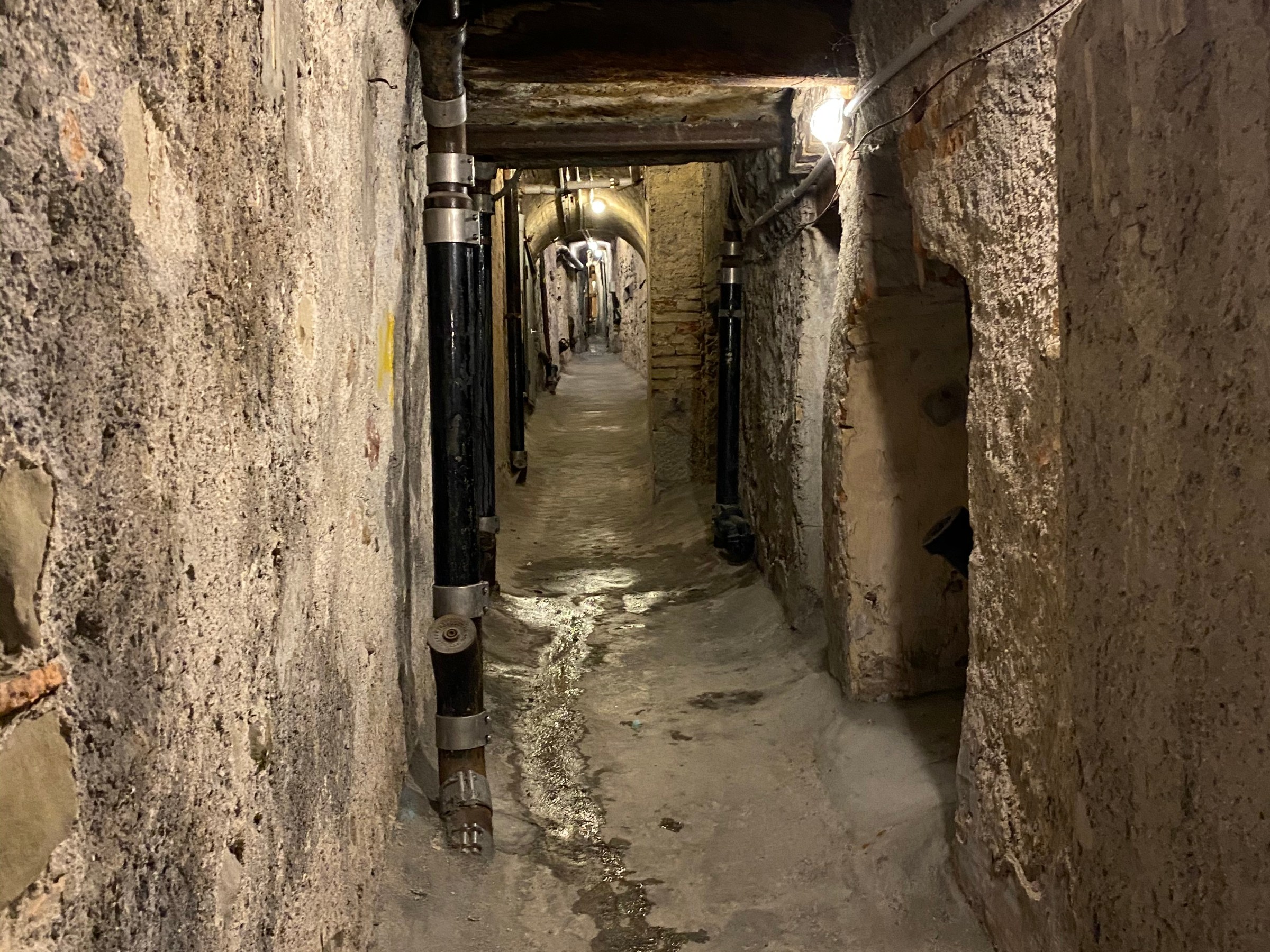 Zurich kept one of these corridors to explain and show the ancient sewage system, so we walked through a (now) clean lane to better understand how it worked. The door to this corridor is well hidden between two buildings in the Niederdorf. We passed so many times but never noticed it. The lane is rather wide at the beginning and gets narrower and narrower. At the other end, we had to squeeze through the exit door to get out on the Oberdorfstrasse.