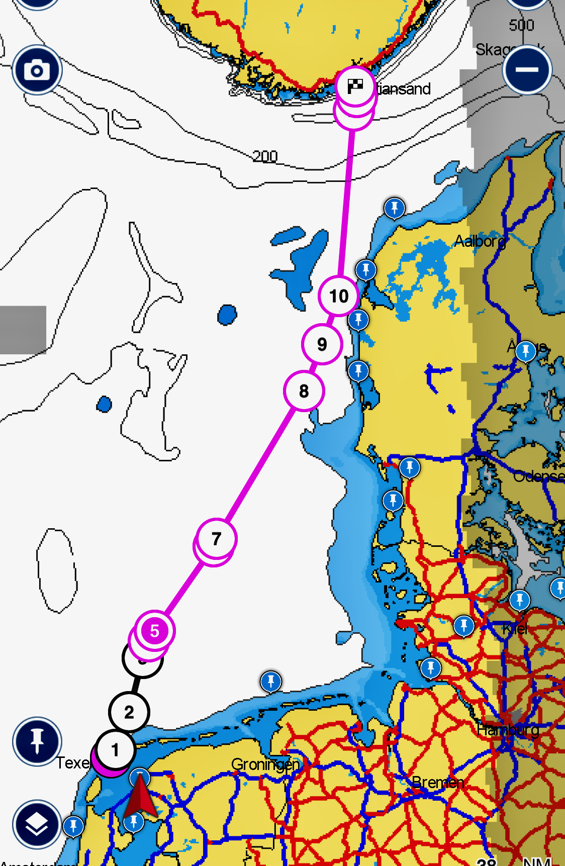 The plan is to sail Maranea (live map) from Makkum in the Netherlands to Kristiansand (or Mandal) in Norway. Weather permitting, there will be about 310 nautical miles to sail north, preferably in one stretch to give us some time to sail the southern coast of Norway we heard so many sailers rave about. So the route is set, the “exotic” food items stowed aboard, and the first hearty meal digested. Off we go…