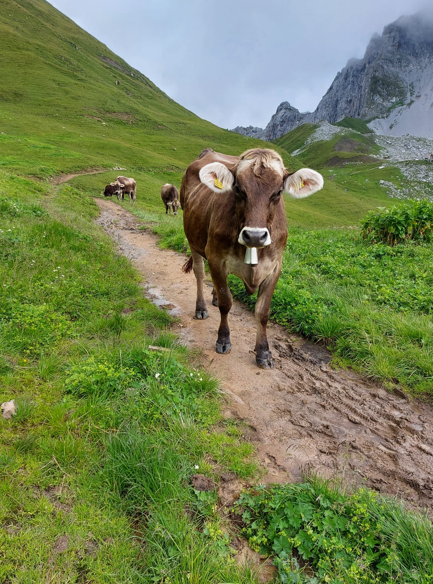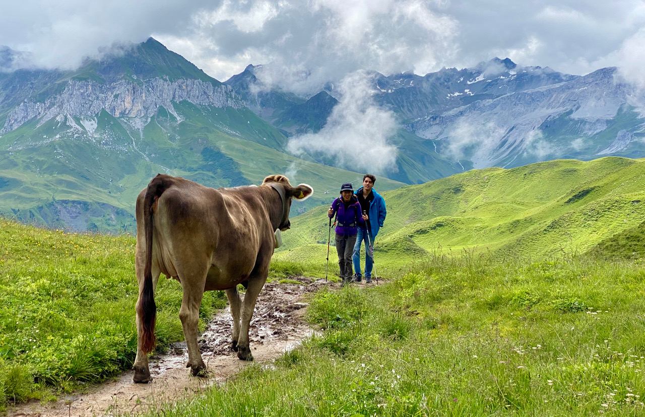 A standoff with a cow on the path (the cow wins).