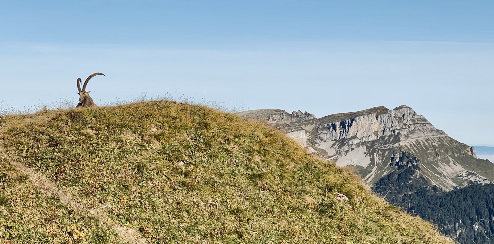 That would not have been necessary. We somewhat climbed the steep 600 m ascent on the north slope of that Augstmatthorn in about an hour and a half. The reward was stunning: magnificent views of snow-capped summits of Eiger, Mönch und Jungfrau and another few hundred peaks of the alps. The turkish blue Lake Brienz was shimmering way below us. We had a surprise appearance of a herd of around 30 ibex resting on the steep mountain slope. They did not take notice of our presence at all.
