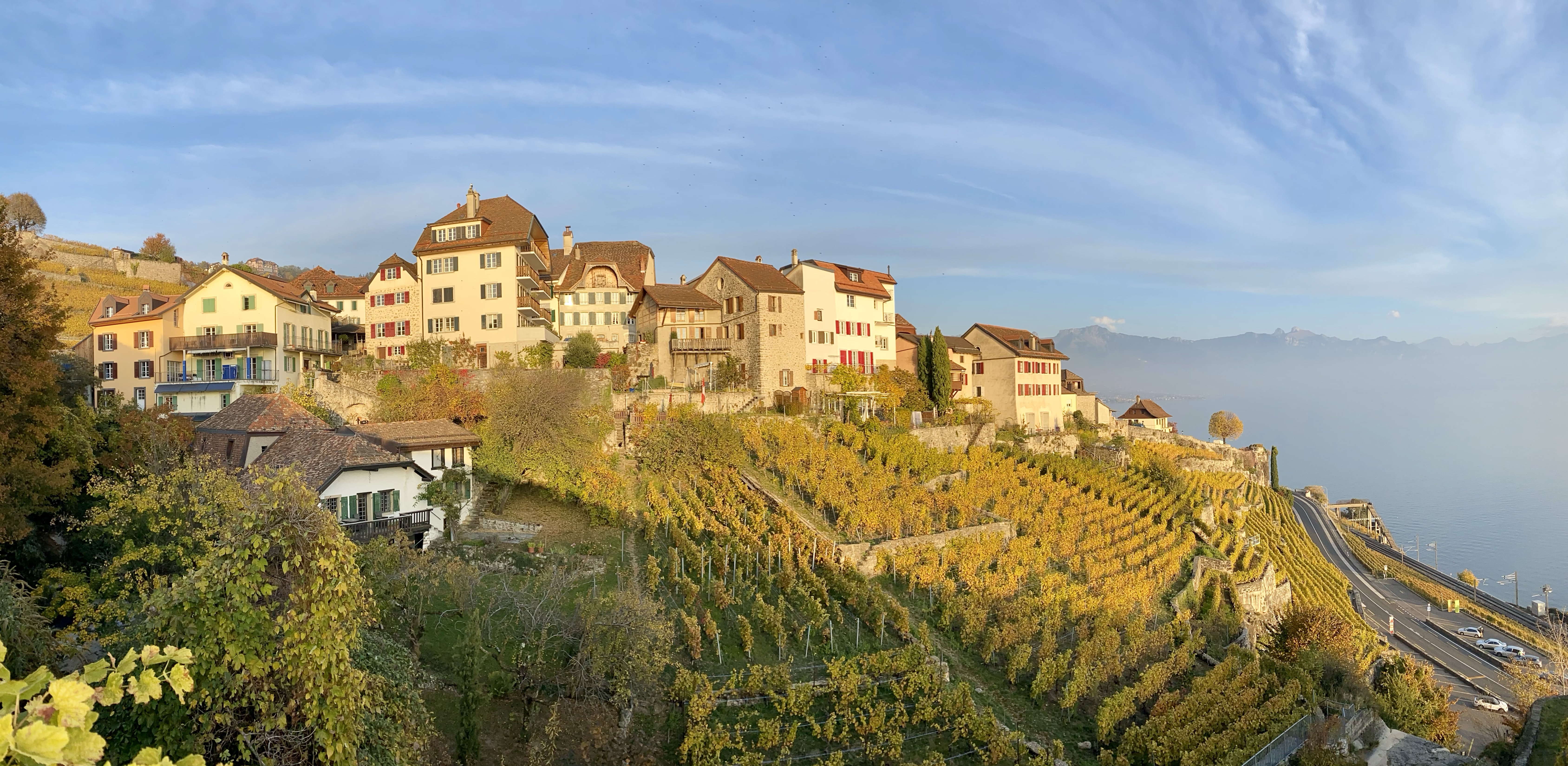 When we arrived at Lausanne before noon, it was hazy and cloudy, but we started from Pully Port anyway. Luckily, in the afternoon, the weather improved, and soon we were walking through the vineyards shining in gold.