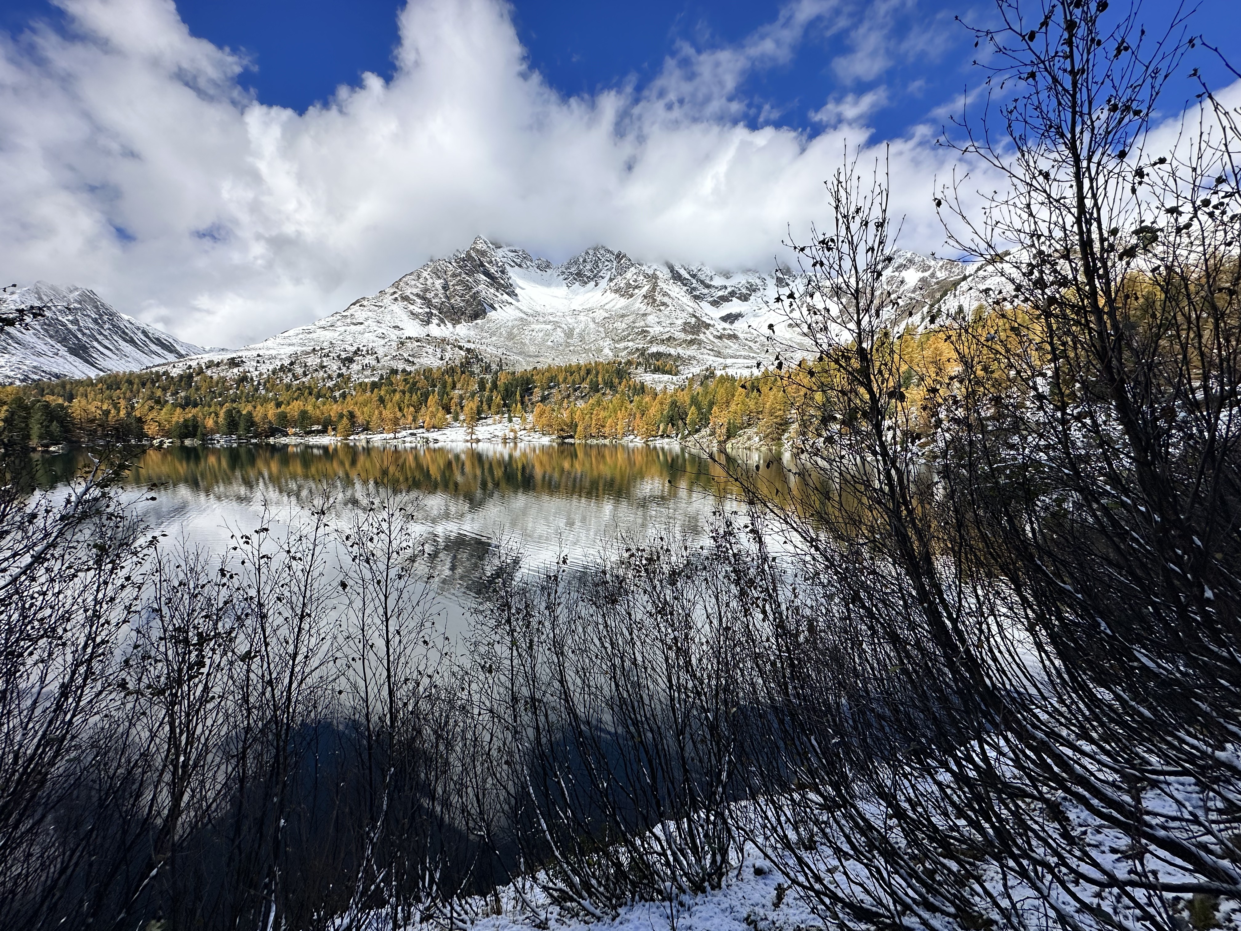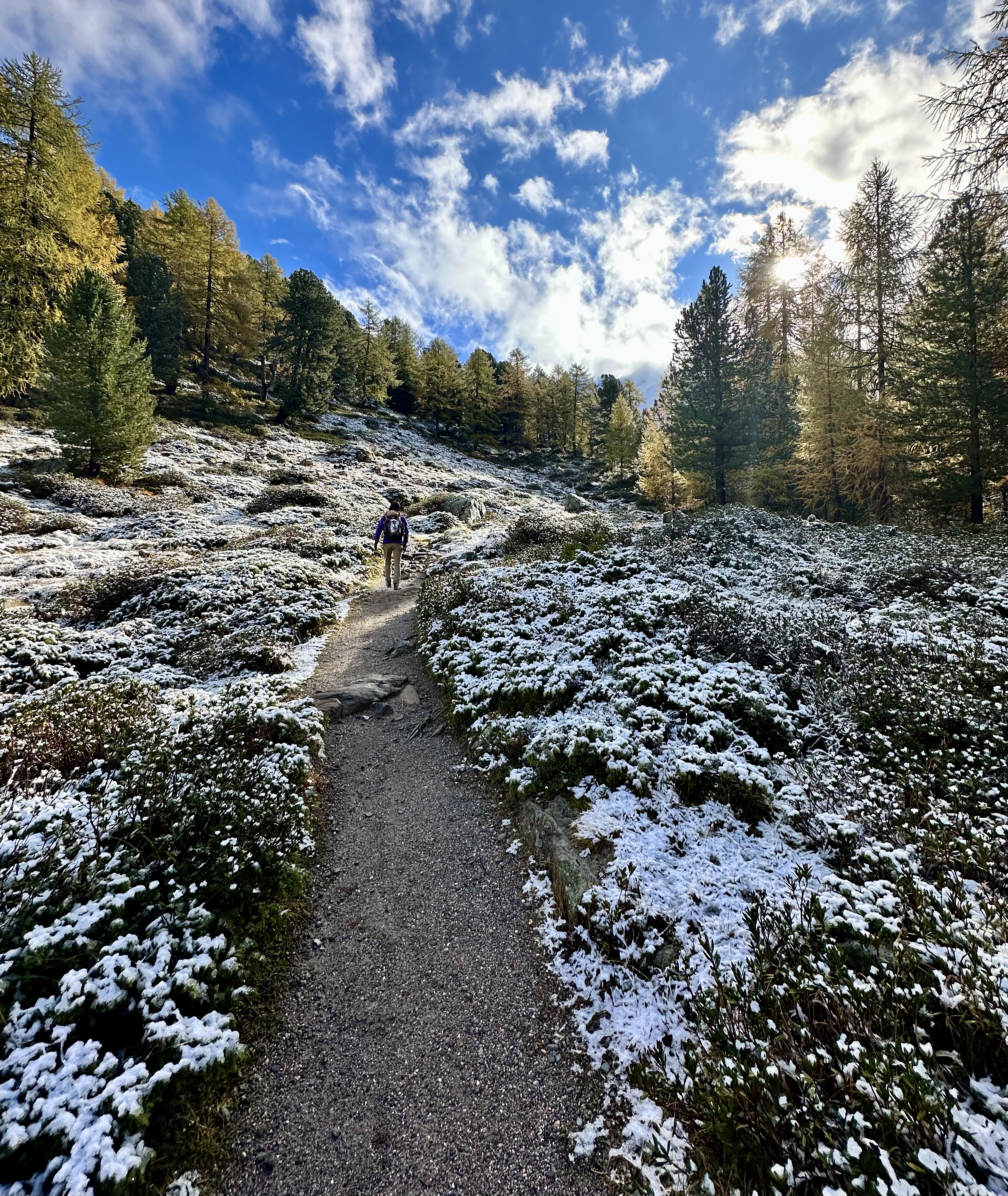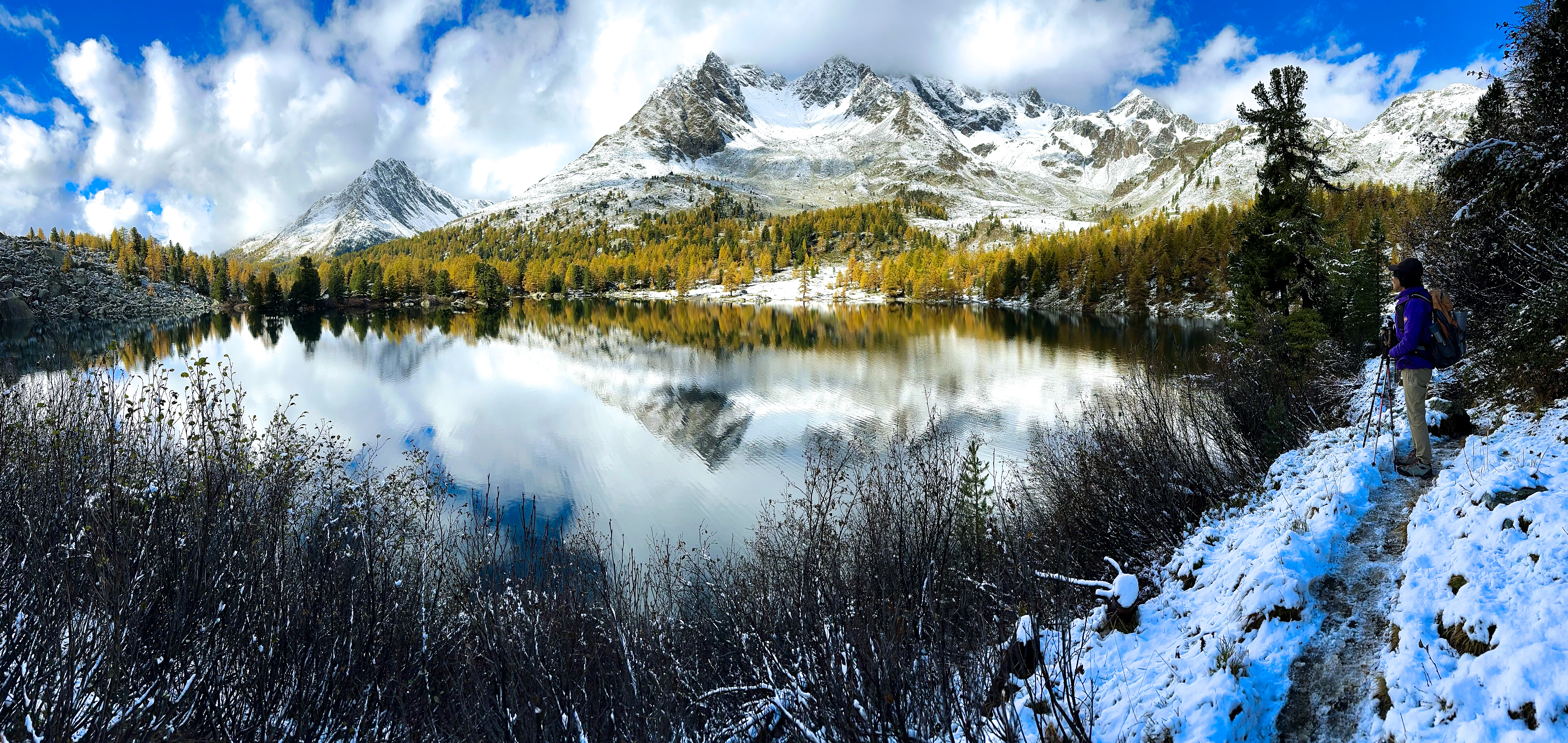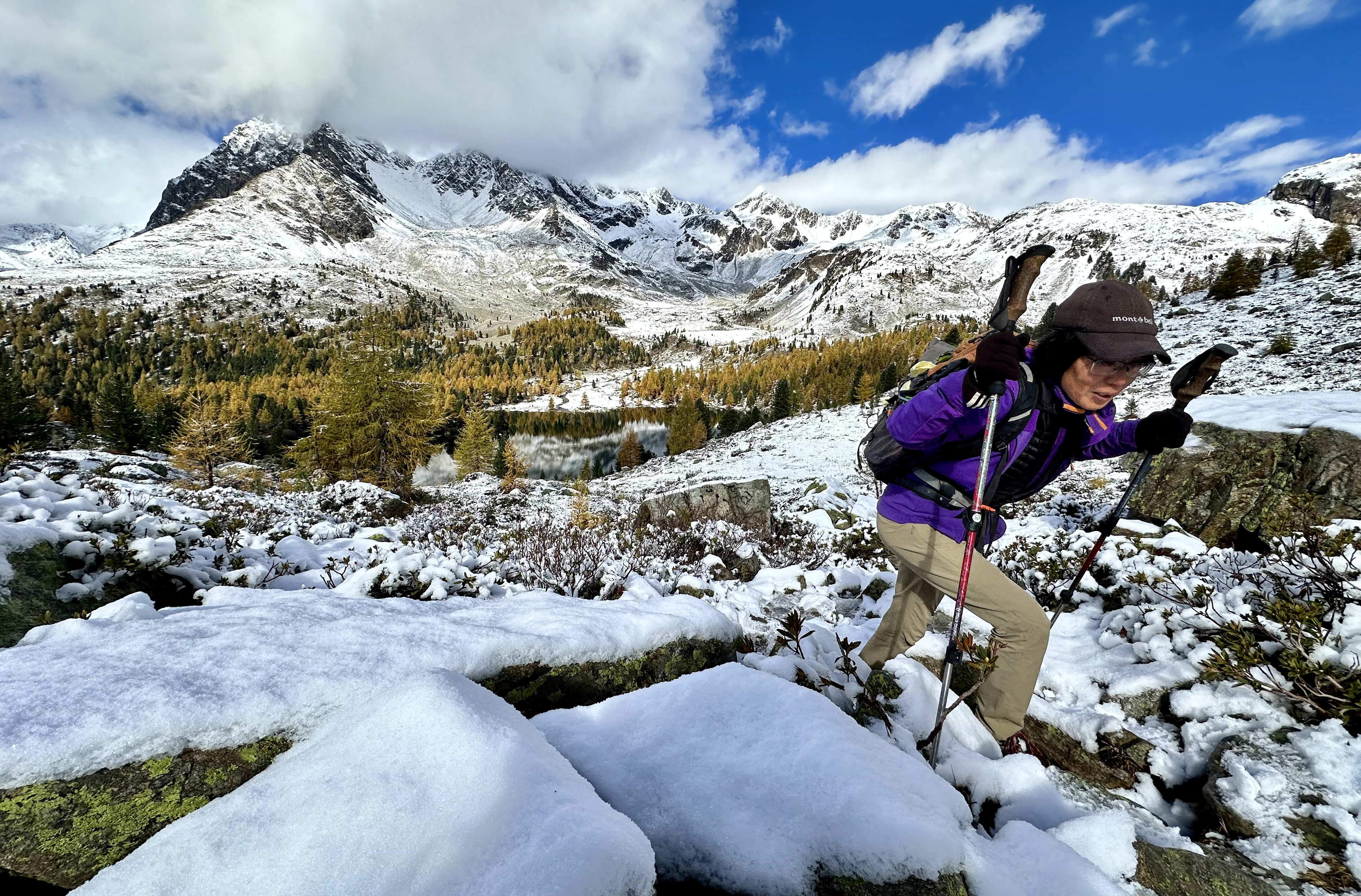 Looking down the Lago Viola from the Val Viola and admiring fantastic colors of yellow larches with the background of snow-covered mountains, we went up to around 2200m. Around this area the new snow covered the path, and we had to follow the footsteps carefully.
