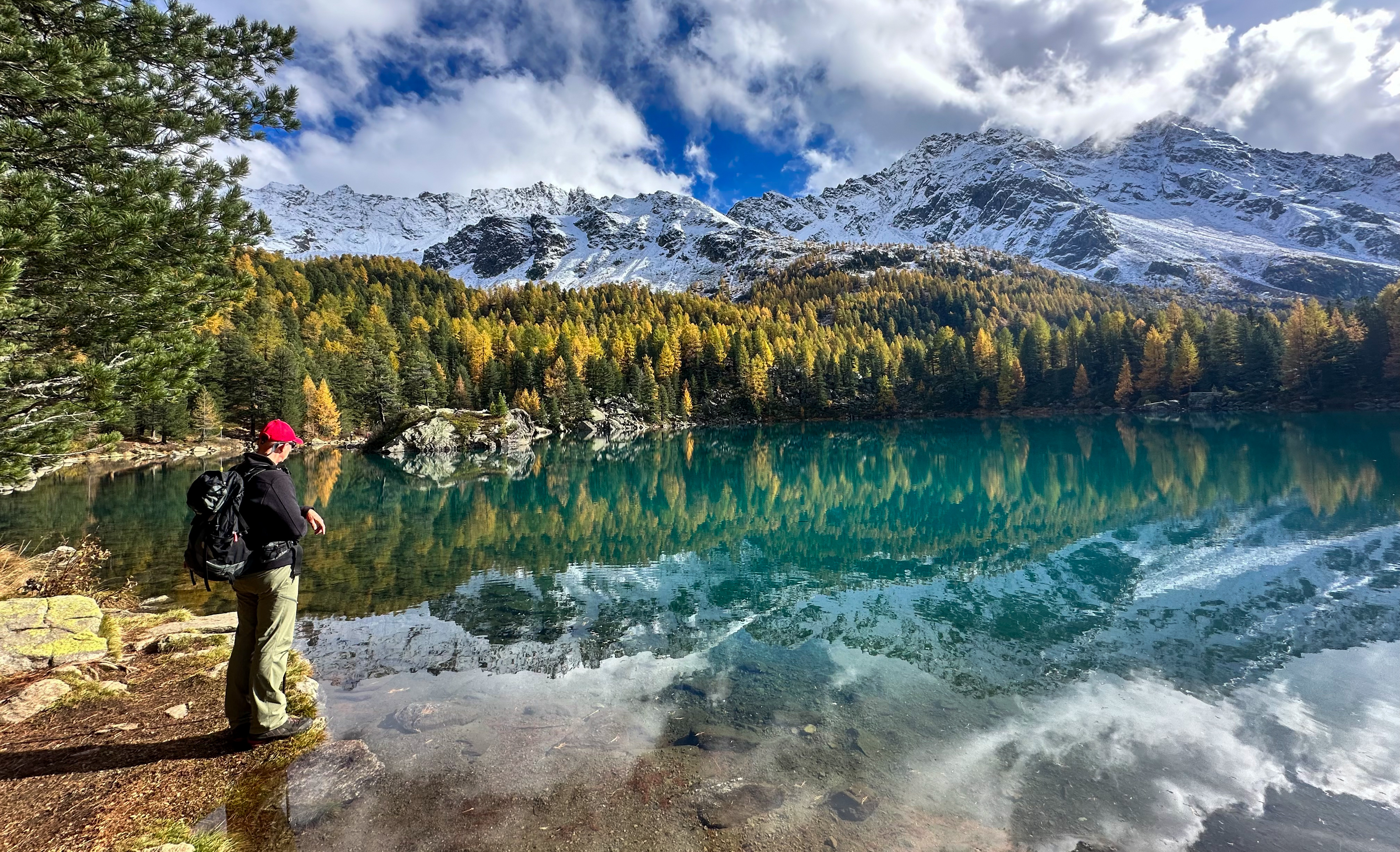 The second lake, Lake Saoseo, is amazing with green water, the yellowed larches and white mountains. The air was crisp, but the sun was shining. We admired the views, along with many other hikers.