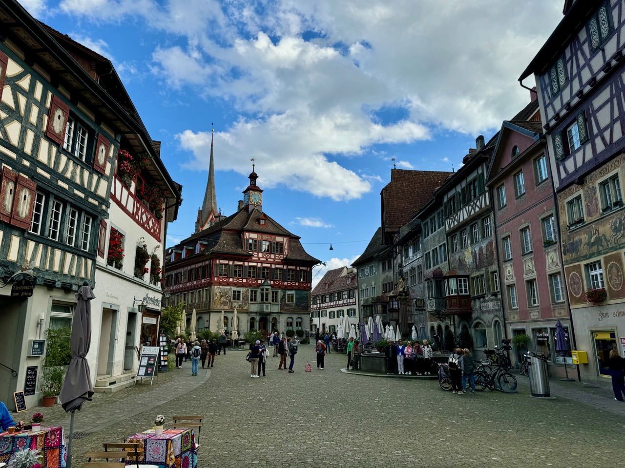 Al día siguiente, emprendimos rumbo a la espectacular cascada del Rin, la más grande de Europa. Fue un espectáculo sobrecogedor contemplar esas enormes masas de agua cayendo con fuerza sobre las rocas, especialmente debido al caudal elevado tras un verano de abundantes lluvias. Después, visitamos Stein am Rhein, un pueblo de cuento con sus casas medievales pintorescas y una atmósfera mágica.