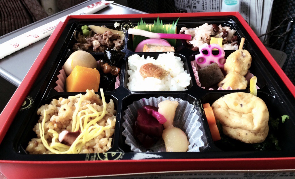 We’re on a train during lunch time. As we had quite early breakfast before Pierre’s departure we knew we would be hungry. So we bought a japanese lunchbox. There are thousands of those, one for every taste and hunger.