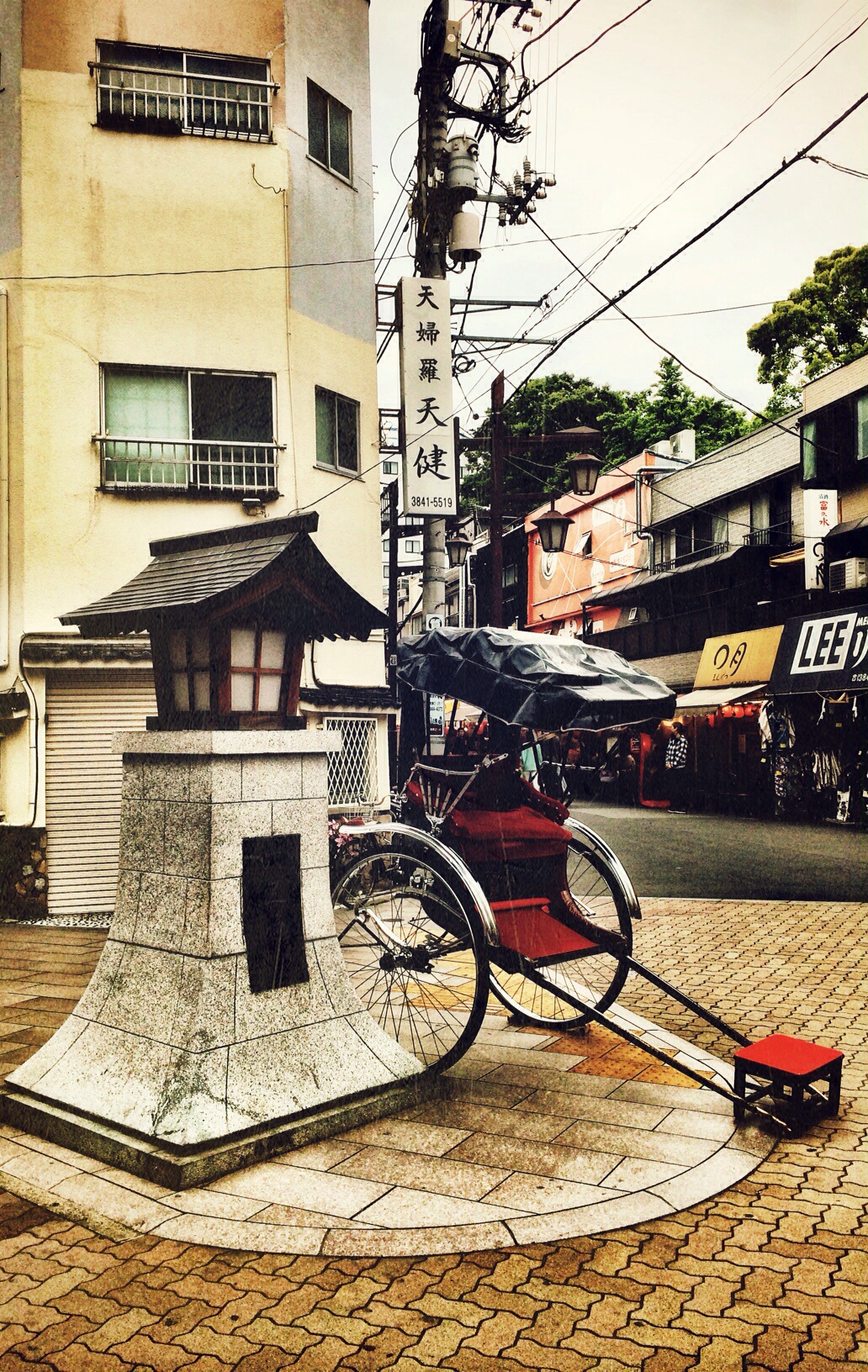 Foto einer Seitenstrasse der “Plastic Food Street” . Kabel hängen von allen Seiten wie überall in Japan. Im Hintergrund der Tokyo Sky Tree.